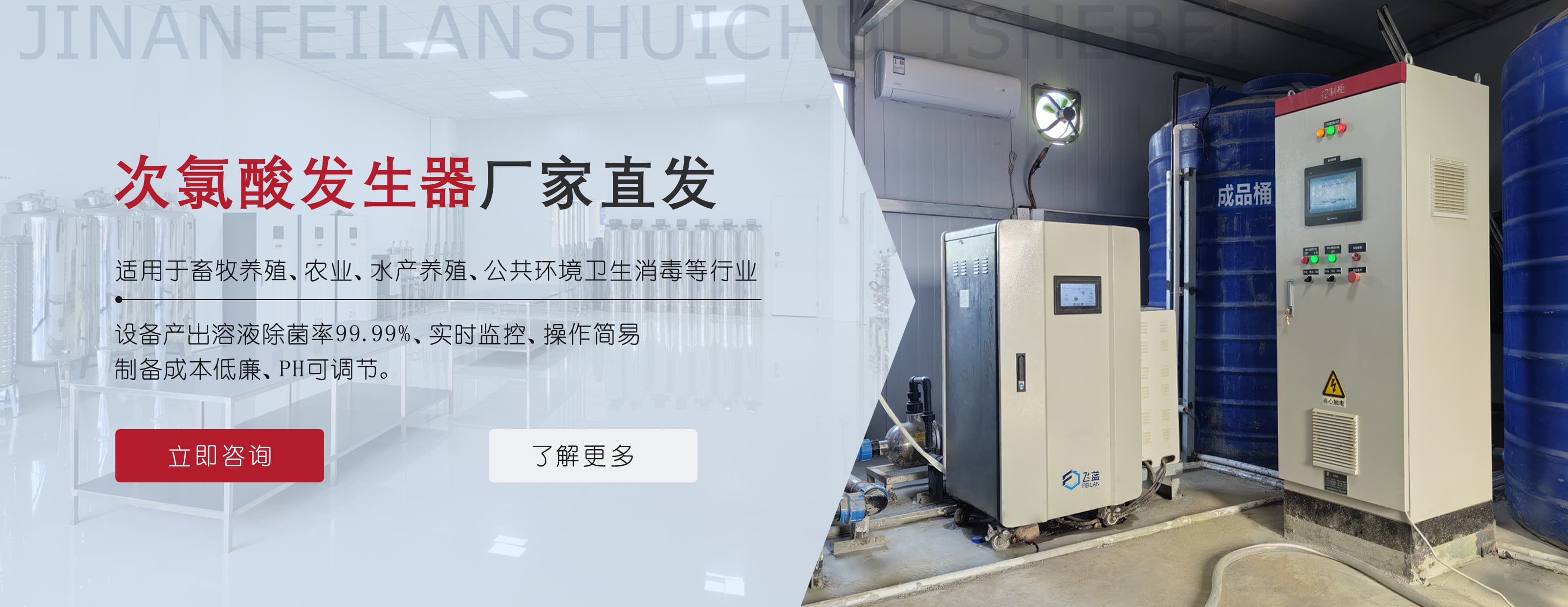 濟南飛藍水處理設備有限公司坐落于山東濟南,注冊資本100萬元,標準廠房2400余平米,研發人員16余名。集研發、生產、銷售、安裝以及售后服務于一體,專注為公共環境衛生、口腔科牙椅管路、食品加工保鮮、畜牧養殖系列以及醫院各個科室服務等提供一站式消殺解決方案。 公司擁有多項專利證書,專注研發次氯酸發生器,提供有效的解決方案。公司具備完善的方案設計、產品開發、設備生產、工程安裝與售后服務,目前...